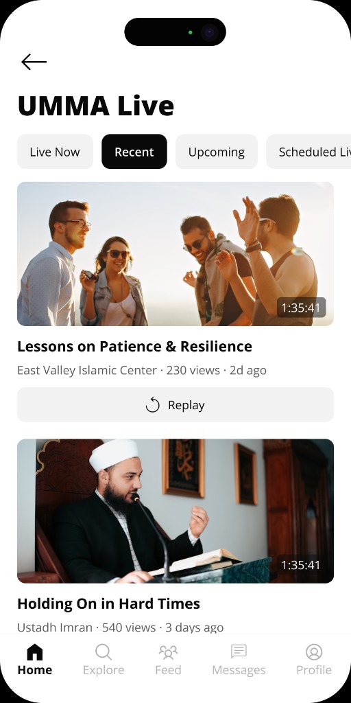 Watch and broadcast live to your community. Friday khutbahs, events, and more.